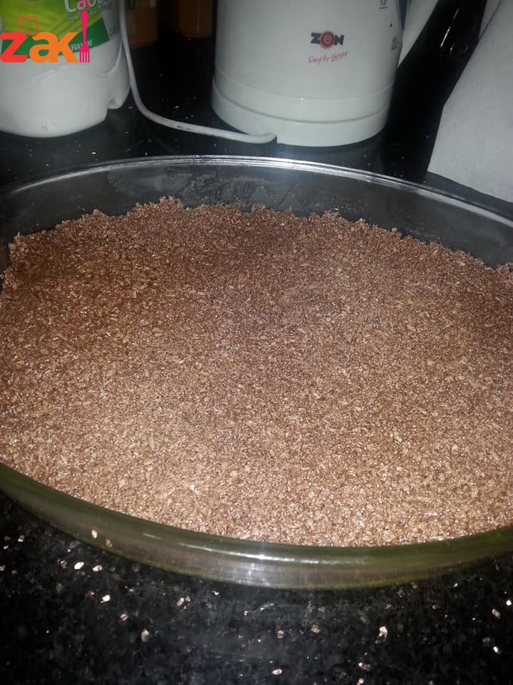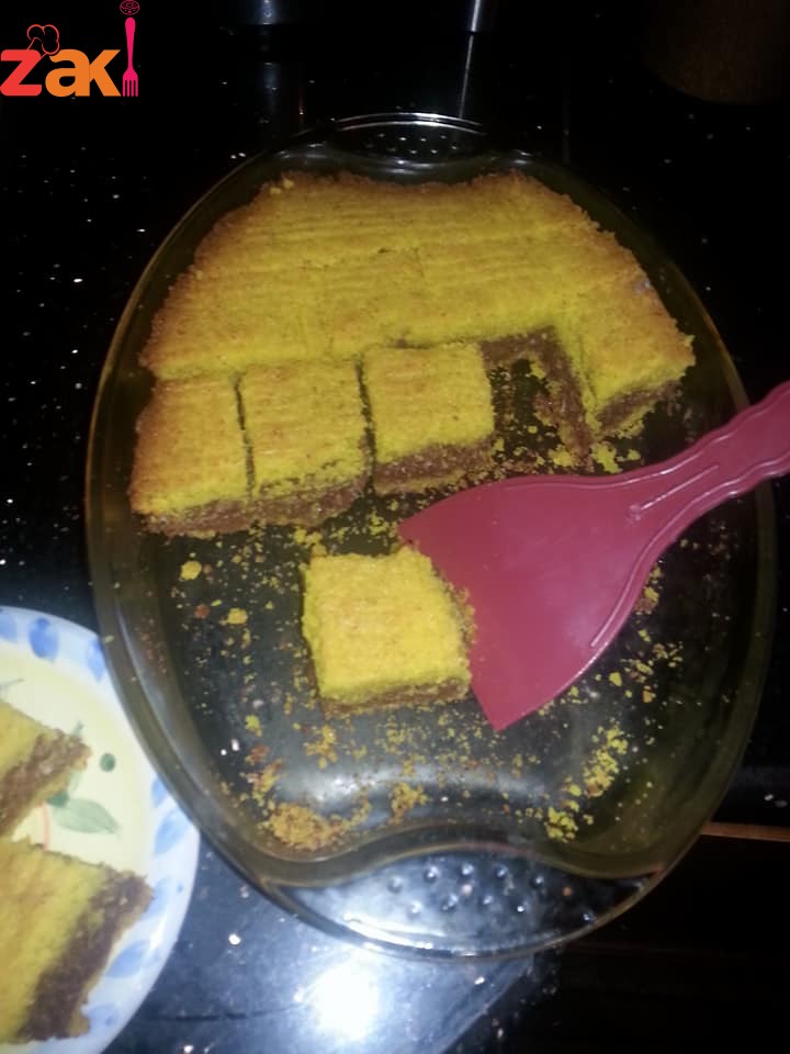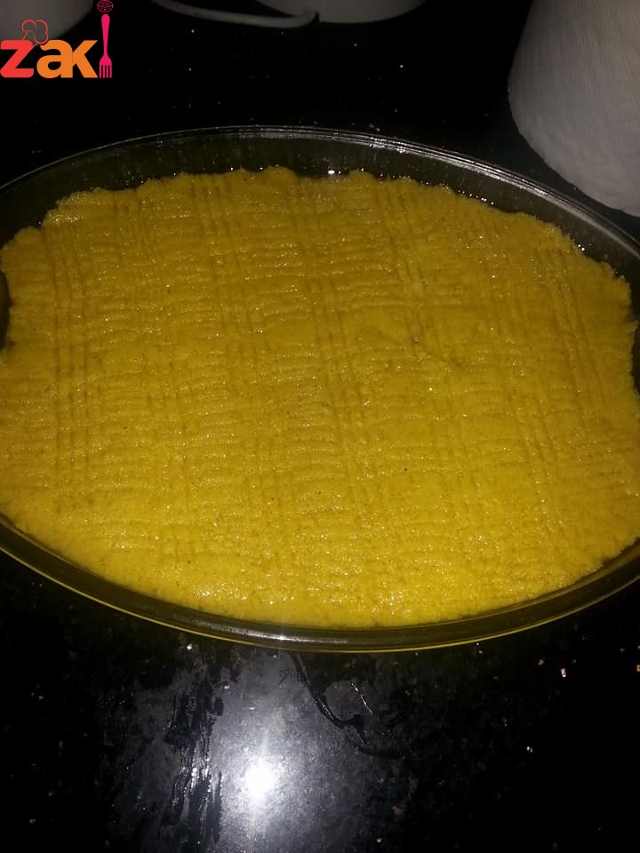 الان بعد مرور نصف ساعة نأخذ المكونات وتوضع في بايركس او صينية مدهونة ويسكب نصف المقدار ويفرد باليد جيداً