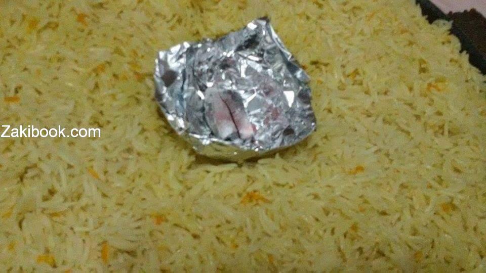 – بندخن الدجاج مع الخضار بفحمه مولعه بنحطها بزيت وبنغطيه بقصدير لحتى تمسك ريحه التدخين بنكشفو وبنضيف الارز المطبوخ طبعا على وجه الخضار وبنحط قصديره على وجه ارز بشكل صحن فيها زيت وبنحط فحمه للتدخين وبنغطي الصينيه بقصدير وبنسكرها منيح بنحطها بالفرن لمده ساعه.