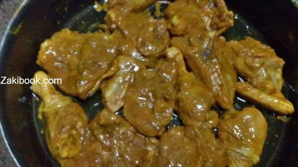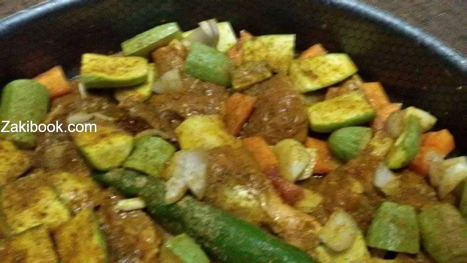 – بنحضر صينيه تيفال وبندهنها زيت وبنصف الدجاج فيها مع بقايا خلطته وبعدها بنضيف الخضار على الدجاج طبعا الدجاج ني والخضار كمان بعدها.