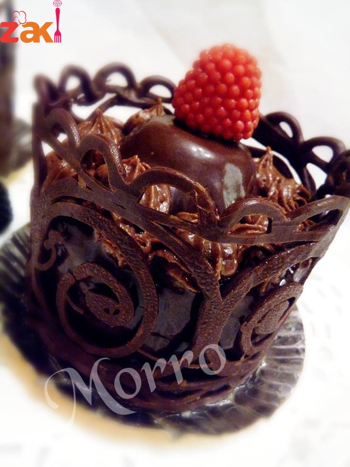 وفي هذه الاثناء نقوم بعمل شريط الشوكولاه المفرغ علي ورق زبده نرسم اي شكل بالشوكولاه الخام واول ماالشوكولاه تتماسك بس تكون لسه طريه نلفها علي الجاتوه ونقوم بنزع ورق الزبده