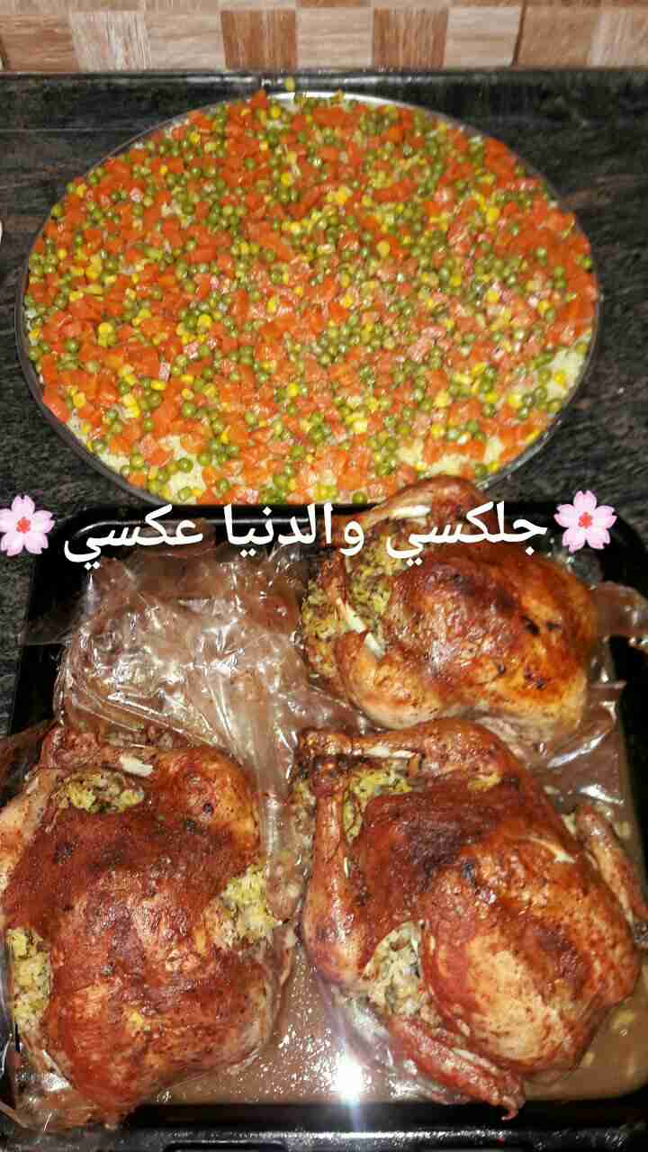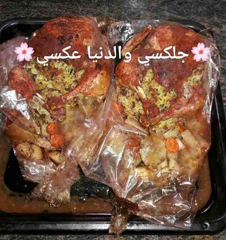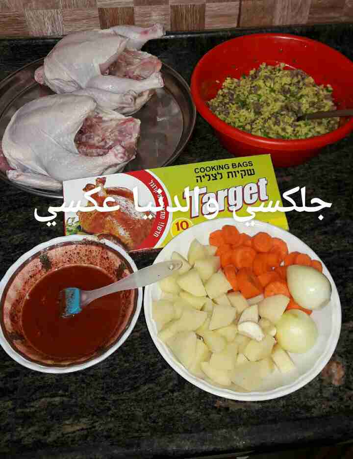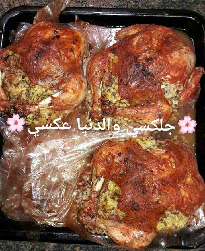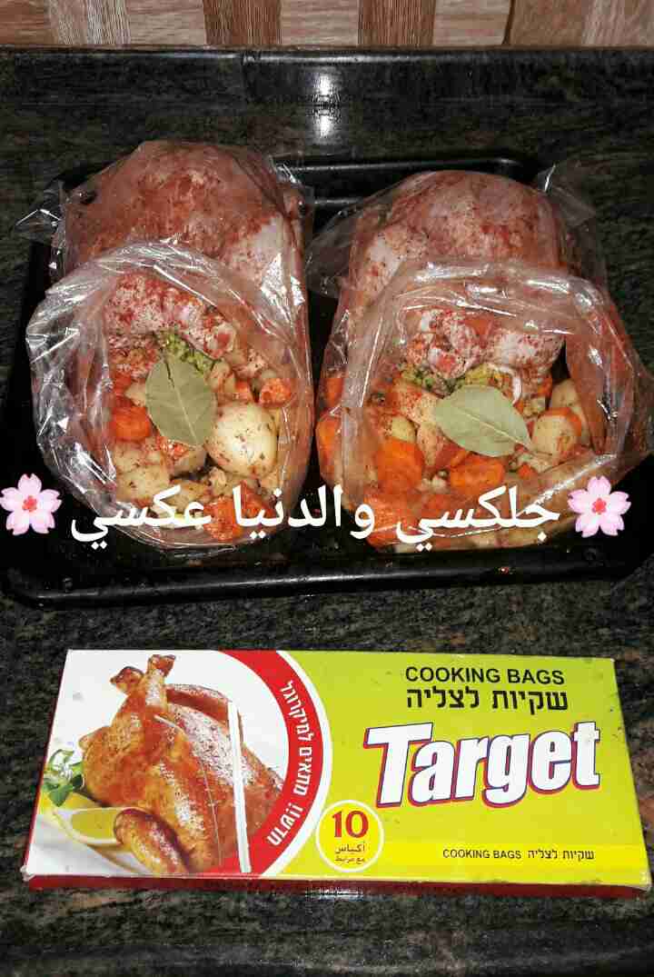 4-ازا حابه تحشي الدجاج بالارز بدك تسلقي الارز مع رشه ملح ورشه كركم خفيفه بس يقارب ع الاستواء بتصفي وبتغسلي من مية السلق بعدا بتحوسي لحمه مفرومه مع زيت ذره مع رشة ملح وفلفل أسود وخلي زيت عليهم بزياده شوي منشان بس ضيفي ع الارز ما يخبص وبتفرمي شويه بقدونس وشوية مكسرات محمصه ومعلقة صغيره من خلطه بهار الدجاج وبتحركيهن منيح وبتحطي سن ثوم جو الدجاجه بعدا بتعبيها من الحشوه وبتربطي الاجرين مع بعض بخيط وبس يستوين بتقصي الخيط وبتشلي وحطيورق غار جو الكيس للنكهه حسب الرغبه😉 بعدا بتحطي الدجاج بالأكياس الحراريه مع فنجان ماء وبتسكريهن جيدا وبتحطيهن بلفرن حسب فرن المتوفر عندك انا بستخدم الكهربائي بحط ع رف الشبك وبشغل الفرن ع نار واطيه من تحت مدة ساعه بعدا بشغل الي فوق وبخليهن يطبخن ع نار هاديه 😊😊