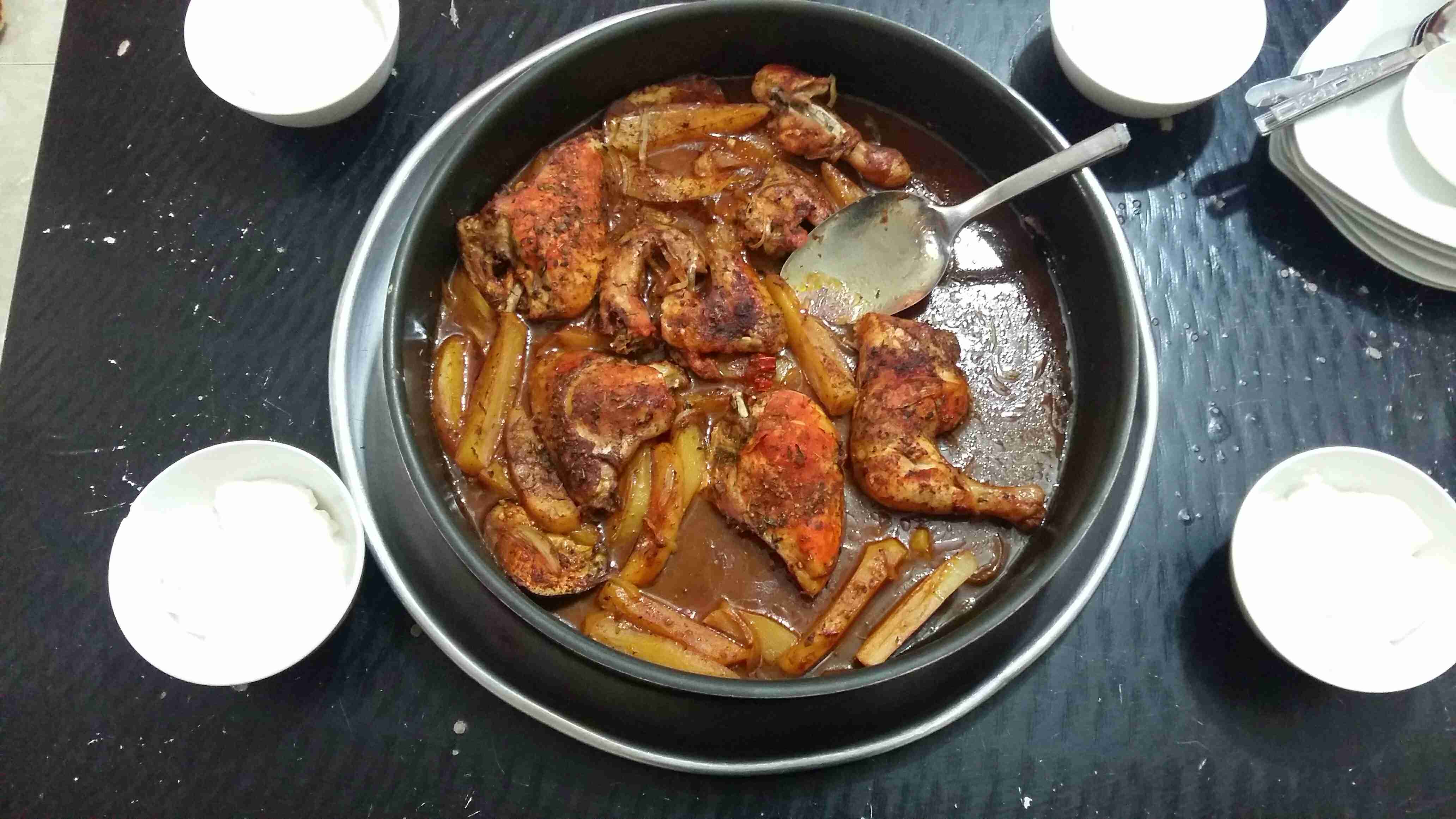 منغسل الجاجة منيح وبعدين بنحطها في صينية مع الخضار وبنبهرهن مع بعض وبنحط عليهن المي وع الفرن ع طول والللف صحة وهنا