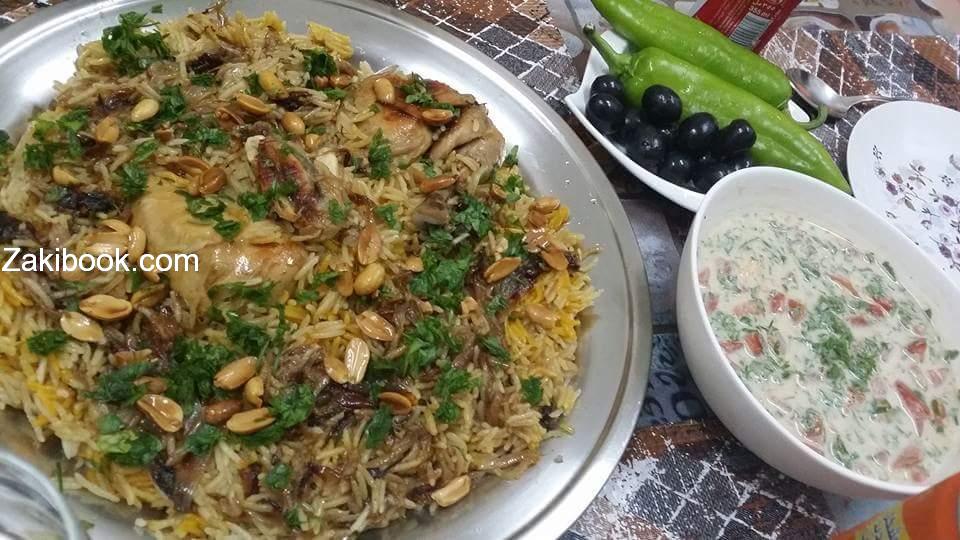 – بنضيف الارز فوقو وبنكمل من مرقه الدجاج وبس يغلي بنوطي تحتو ليستوي, بنضيف صفار الزعفران او كركم مدوب بشوي من المرقه على وجه الأرز خط بس.