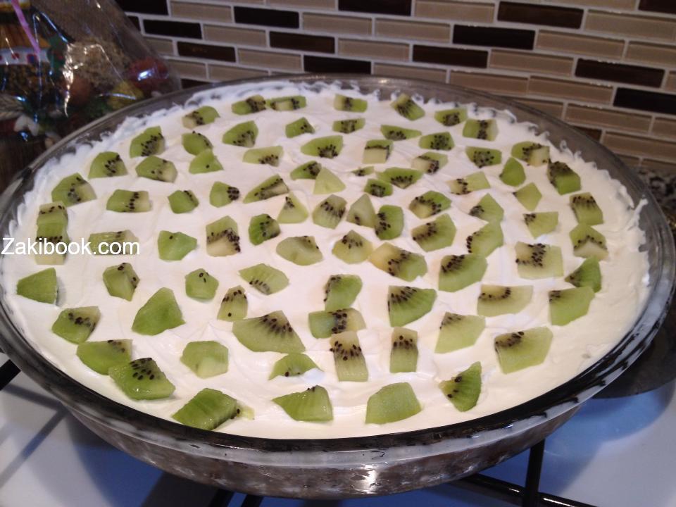 – وبس نخرجها من الفرن نسقيها بالقطر, ونتركها تبرد وبعدين نزينها بكريمه وكيوي, وصحتين وألف عافية.