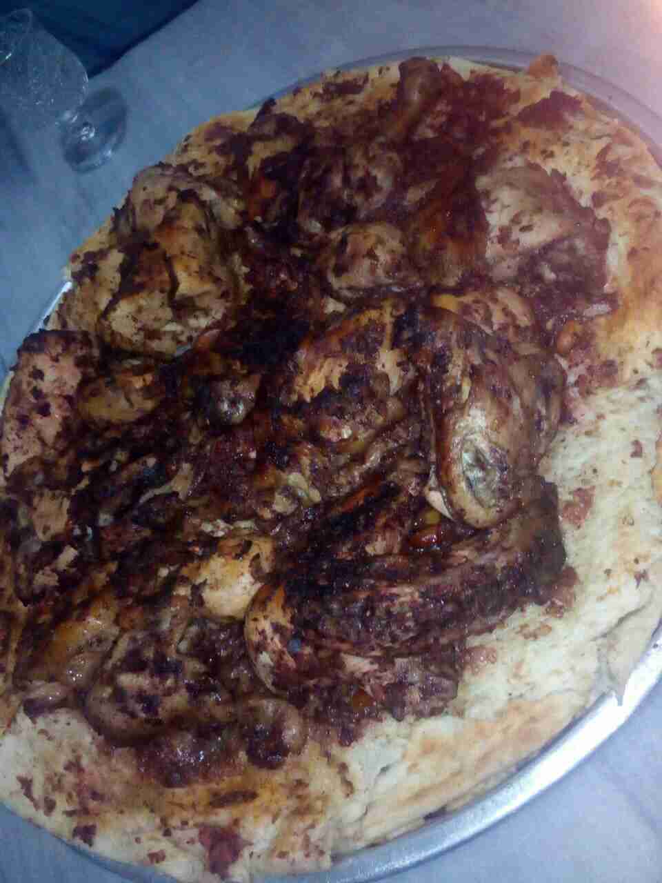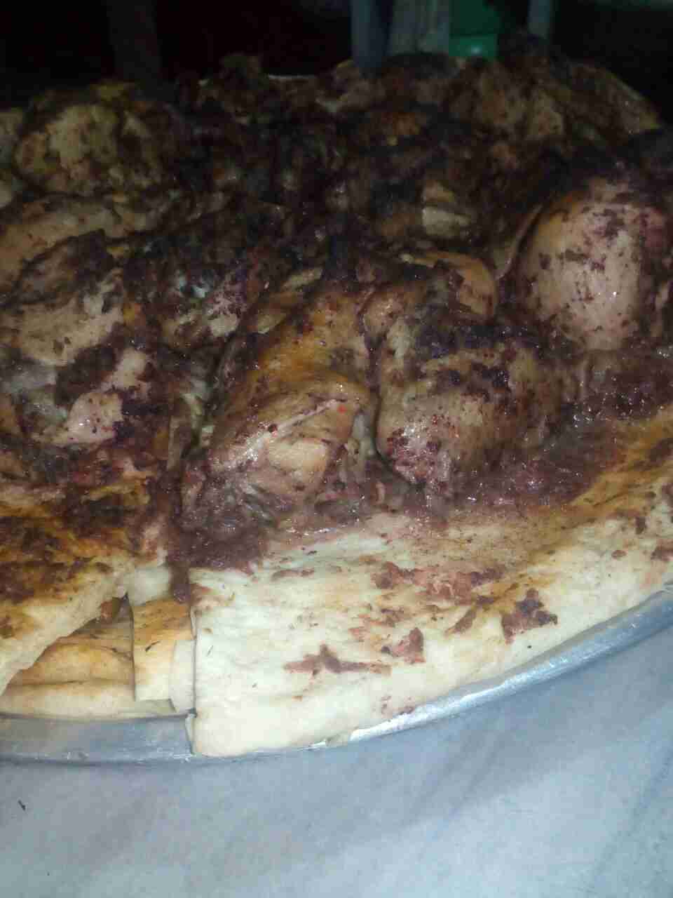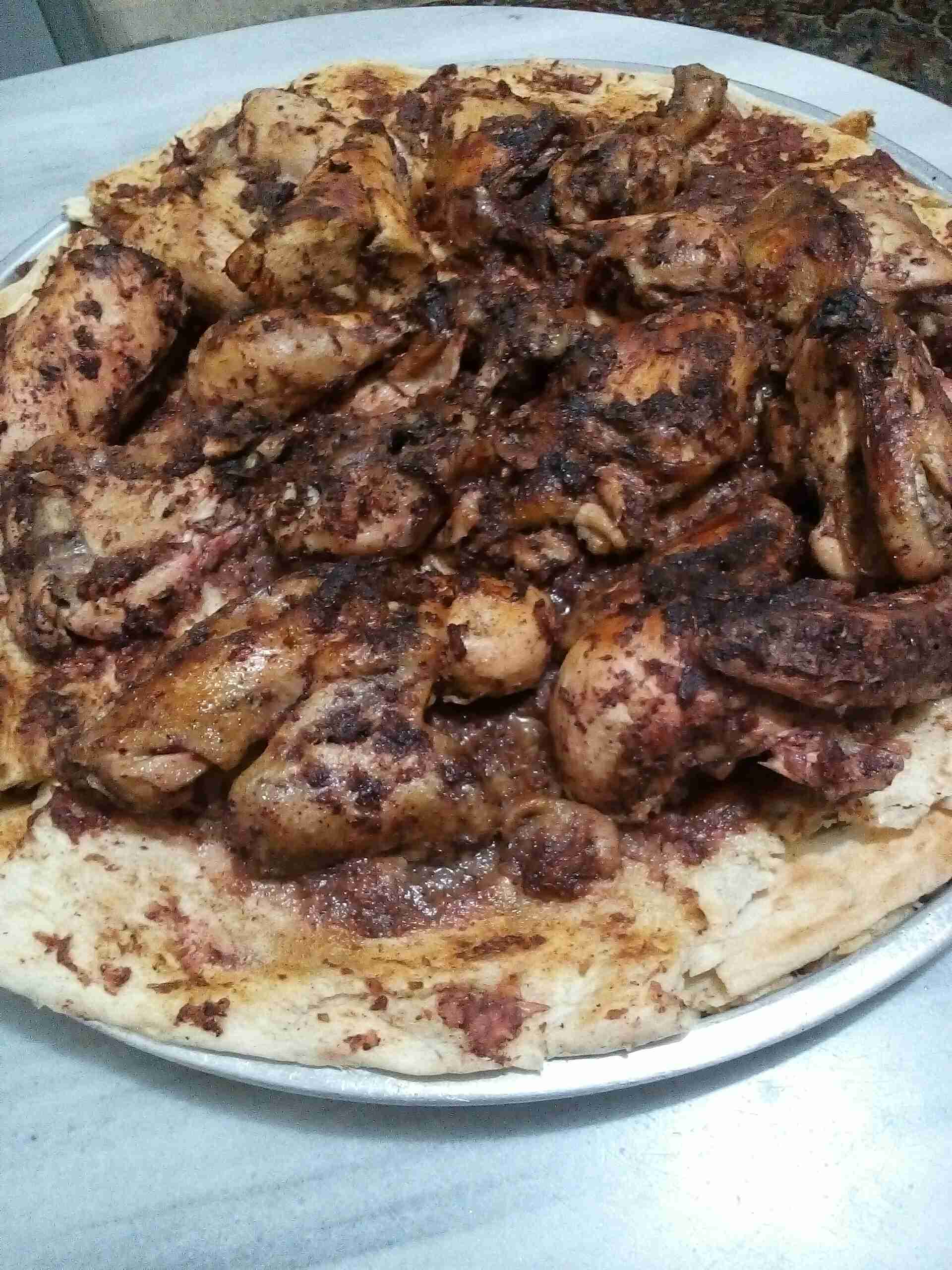 بس استوى الجاج طلعته من المرقه وجبت سدر ودهنته زيت زيتون وغمست الخبز بمرقة الجاج وصفيت اول طبقة بالسدر وحطيت فوقها طبقه من البصل وحمرتها