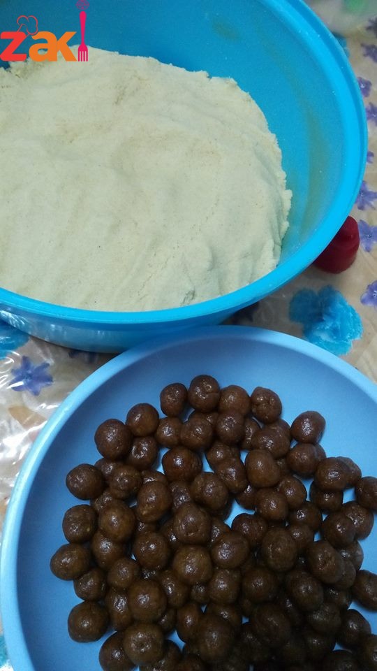 بنبس السميد مع الزبدة والسمنة بنفركهم منيح بالايد لمدة كم دقيقة بعدين بنغطيهم لمدة يومين او تلات ايام وبعدين بنضيف باقي المواد عليهم وبنعجنها لتتماسك وتصير تتشكل معك وبتبلشي فيها بتحشيها تمر او فستق حلبي او جوز