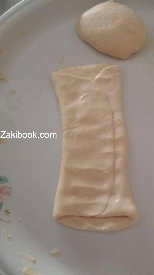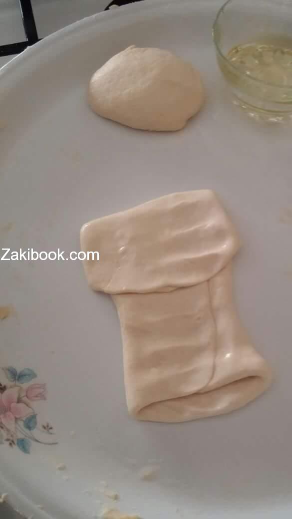 – العجينه تكون طريه و ملساء نعملها كرات ونحل كل واحده بالزيت ونطويها ع 4 متل الصوره بالزيت.