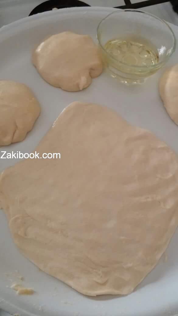 – بعد ما ارتاحت العجينة, اعمليها كرات وتفرديها بها الشكل وكل مره تدهني زيت.