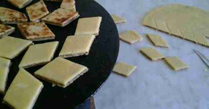 - نقسم العجين على 2ونقوم بتشكيله قرص ونرققه قليلا فقط ونشكل كذلك قرص آخر من التمر ونضعه فوقه وكذلك مع بقية العجينة نضعها فوق التمر ثم نقوم بغلق الأطراف ونقوم بترقيق المبرجة ونتركها بسمك 1سم أو 2سم ونقصها على شكل معينات ونطهوها في مقلاة تيفال أو صاج على نار هادئة حتى تطهى على الجهتين والطريقة موضحة في الصور في الاسفل