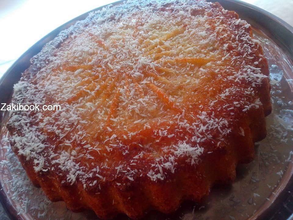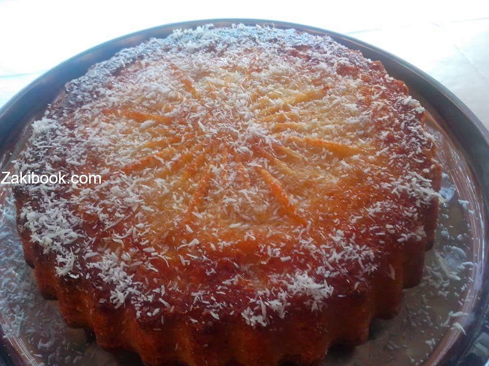 – بعد الانتهاء من الخبز نسقي الكيك بملعقتين كبار من القطر ونزين الوجه بجوز الهند المبروش. بالعافية.