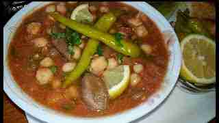 نضع الحمص و الفول في صحن التقديم ونضع عليه الصلصة و نزينه بشرائح الليمون وقرون الفلفل الحار مقطوع وحبة الطماطم المقطعة ويقدم