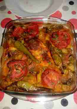 من جهة أخرى نقوم بقلي البطاطا المقطعة دوائر ونضعها في قالب يدخل للفرن ونضع فوقها الطماطم المقطعة دوائر و الفلفل الاخضر الحار مقطوع دوائر والفلفلة الكاملة ونرش فوقها الكمون وبعد طهي الدجاج نضعه فوقها ونضع فوقها المرق الذي طهي فيه الدجاج وندخلها الفرن إلى أن تطهى وينقص المرق واذا لم يتحمر الدجاج نقوم بقلبه خلال الطهي إلى أن يتحمر ويطهى كل شيئ ويتقدم