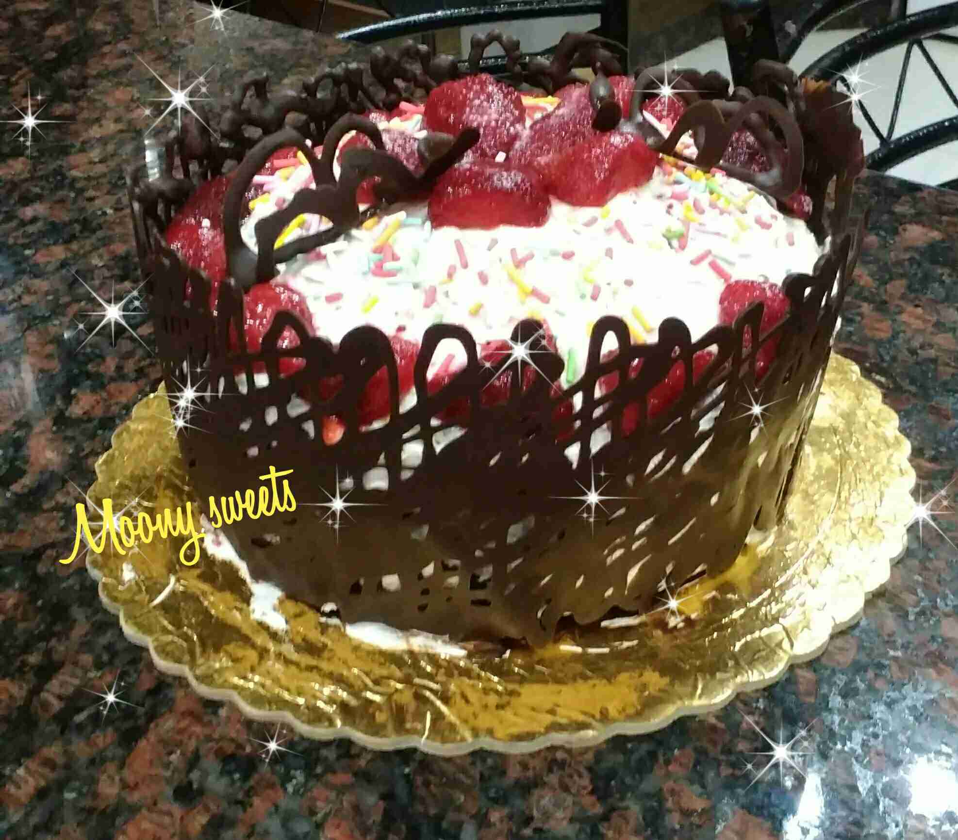 بعدين حطيتها بكيس حلواني وحبت ورق الزبدة ( بده يكون مقصوص ع قياس الكيكة ) بعدين عملت بالشوكولا عالورق خطوط عشوائية وتركتها وقبل ماتجمد الشوكولا عالاخر حطيتها حولين الكيكة وحطيت الكيكة بالتلاجة وبعد نص ساعة شلت ورق الزبدة وبعدين زينت الكيكة بالفراولة