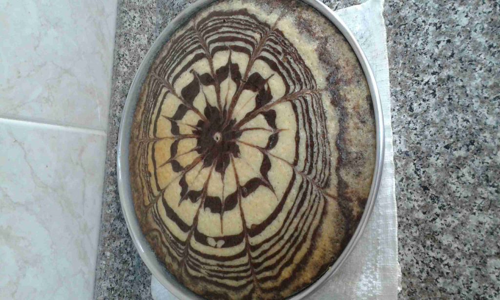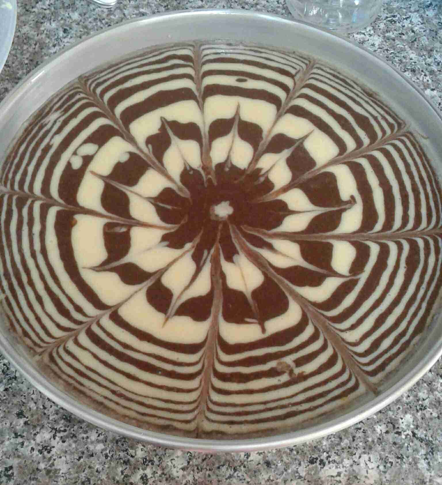 بنخلط جميع المقادير ماعدا الكاكاو وبنقسمه نصين بنصيف الكاكاو على نص والتاني بنخليه ابيض وبنعمل بمغرفتين او غلايتين او كاستين دائرة بيضه وبنصها دائرة بالكاكاو وهيك لحتى يخلص الخليط