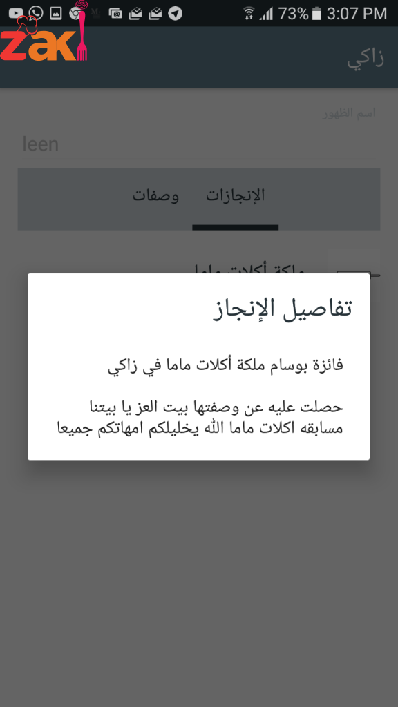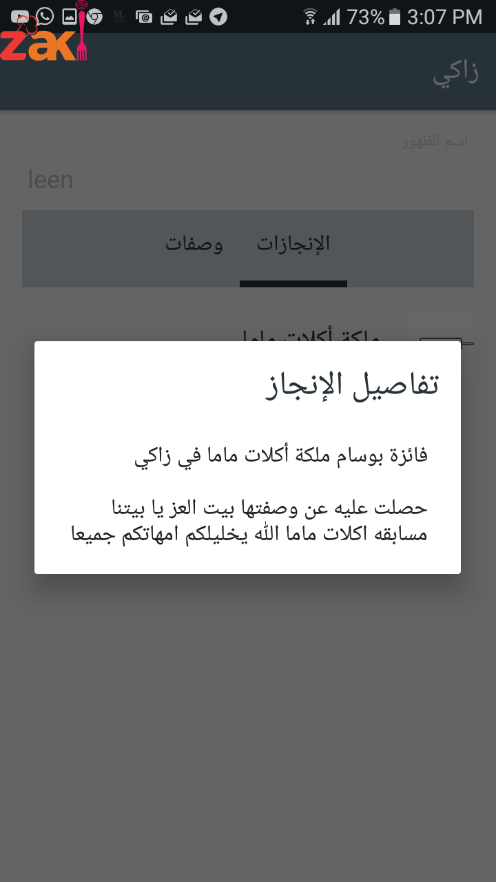 ونذكر أن كل شخص يقوم بإضافة وصفاته عبر تطبيق زاكي تقوم منصة زاكي بنشر وصفاته ليراه جميع متابعين زاكي في مختلف أرجاء العالم علق بكلمة مبروووك لتصل نتيجة المسابقة لأكبر عدد ممكن