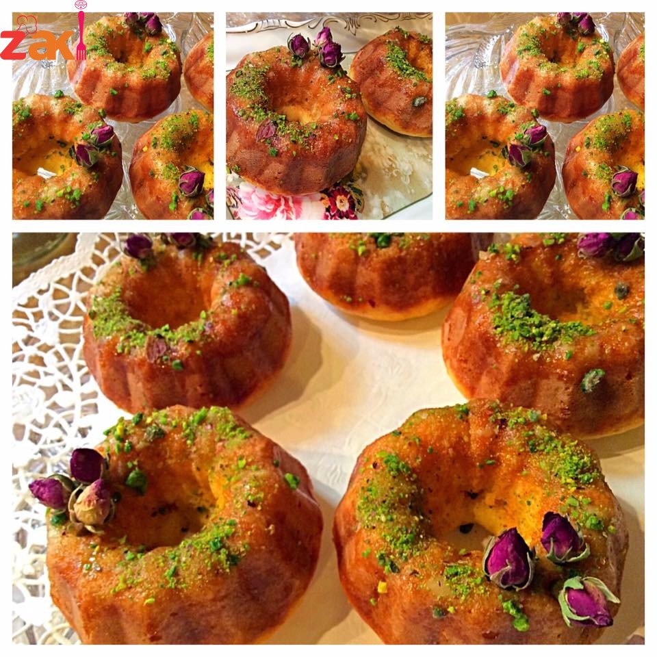 بعد الاستوا يرفع الكيك من القوالب ويغمس او يدهن بالعسل الساخن مع قليل من ماء الورد ويزين حسب الرغبه بالفستق اما بالسمسم .