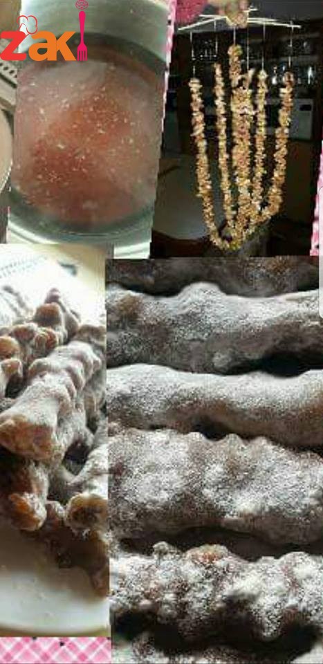 نلضم الجوز بالخيط على شكل طوق بنهايه عود خشبي صغير للنشر والتباعد