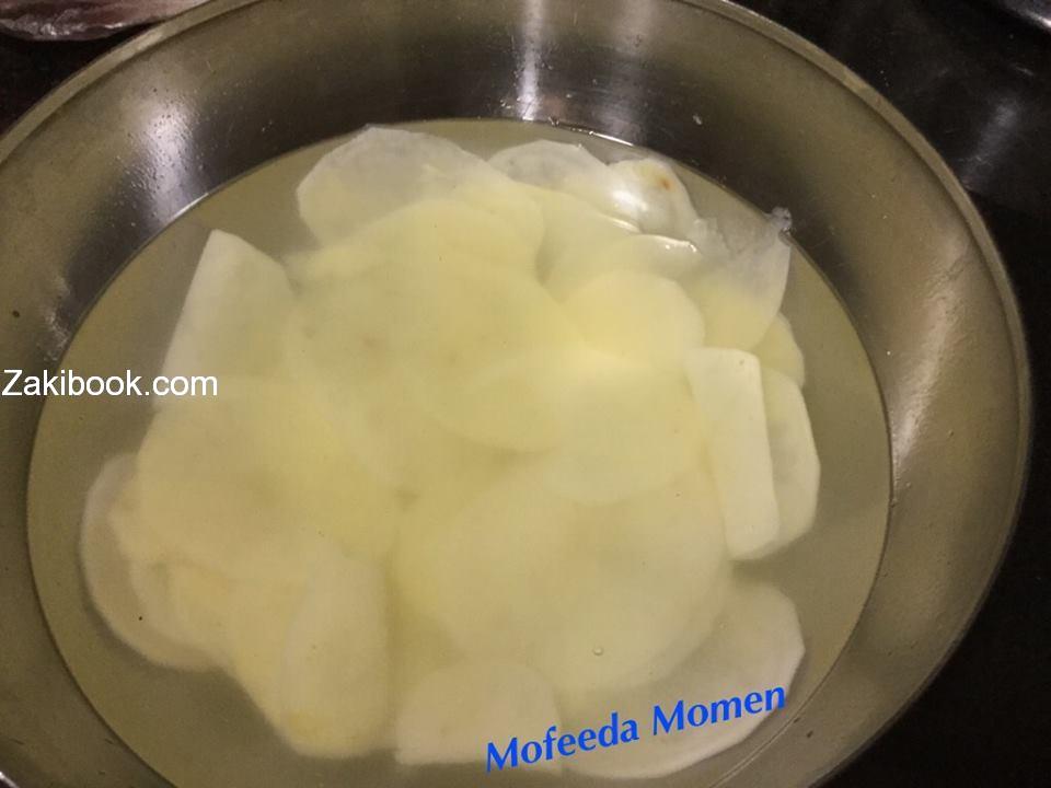 – بنجيب نصف كيلو بطاطس ونقطعها بقطاعة الشيبس وننقعها في ماء مضاف اليه ملعقتين خل وملعقة ملح مدة ساعة.