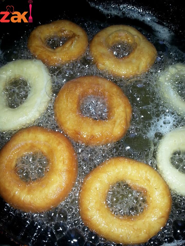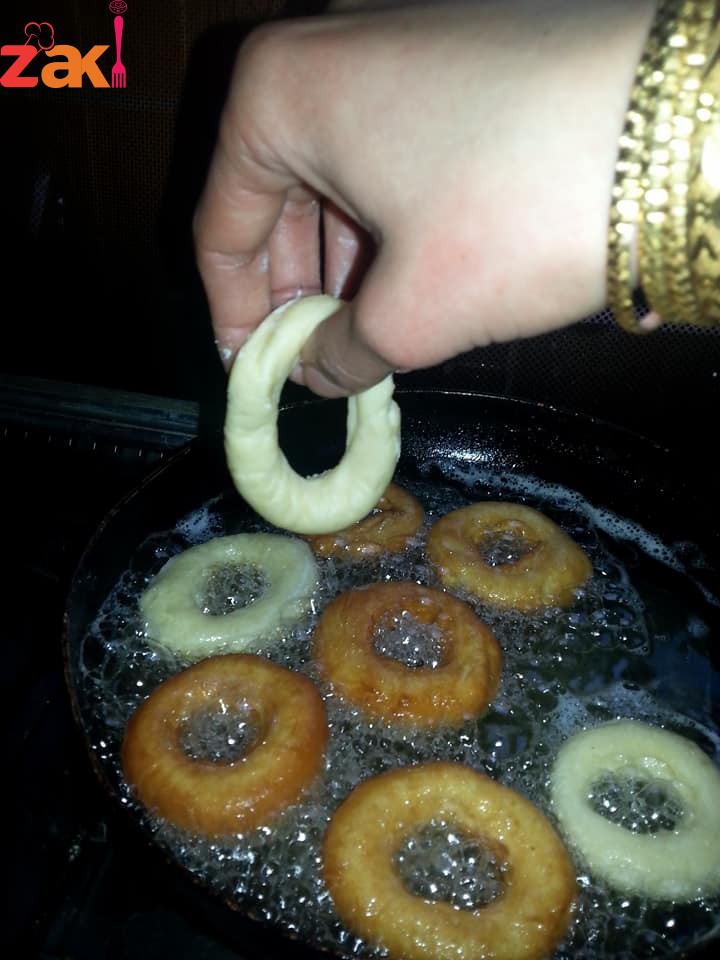 ثم يقلى بزيت غزير حامي حتى الاحمرار ثم نخرجة نتركة حتى يبرد ثم يغطي بالشوكولاتة او اي زينة زي ما بتحبي وصحتين