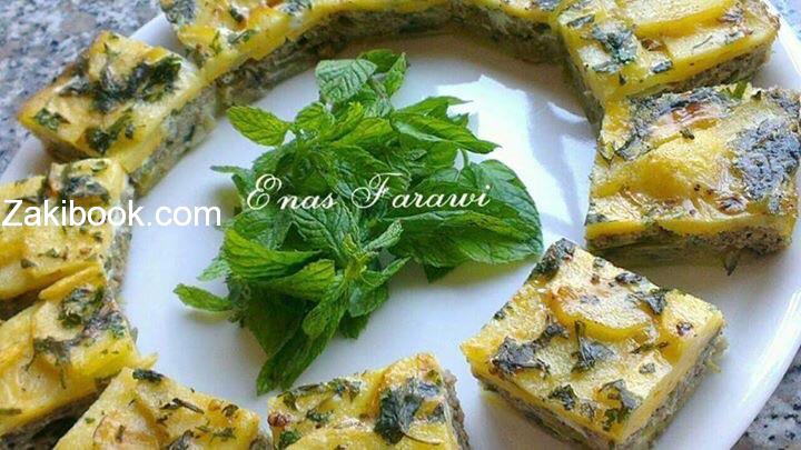 – في طاجين صغير نصف طبقة بطاطا وبعدها طبقة باذنجان وبعدها طبقة الفلفل وبعدها طبقة اللحمة المفرومة ونضرب بيضتين ونتبلهن ونوزعهن عالمفروم نبشر عليه جبنة ونحط طبقة اخرا باذنجان واخيرا البطاطا.