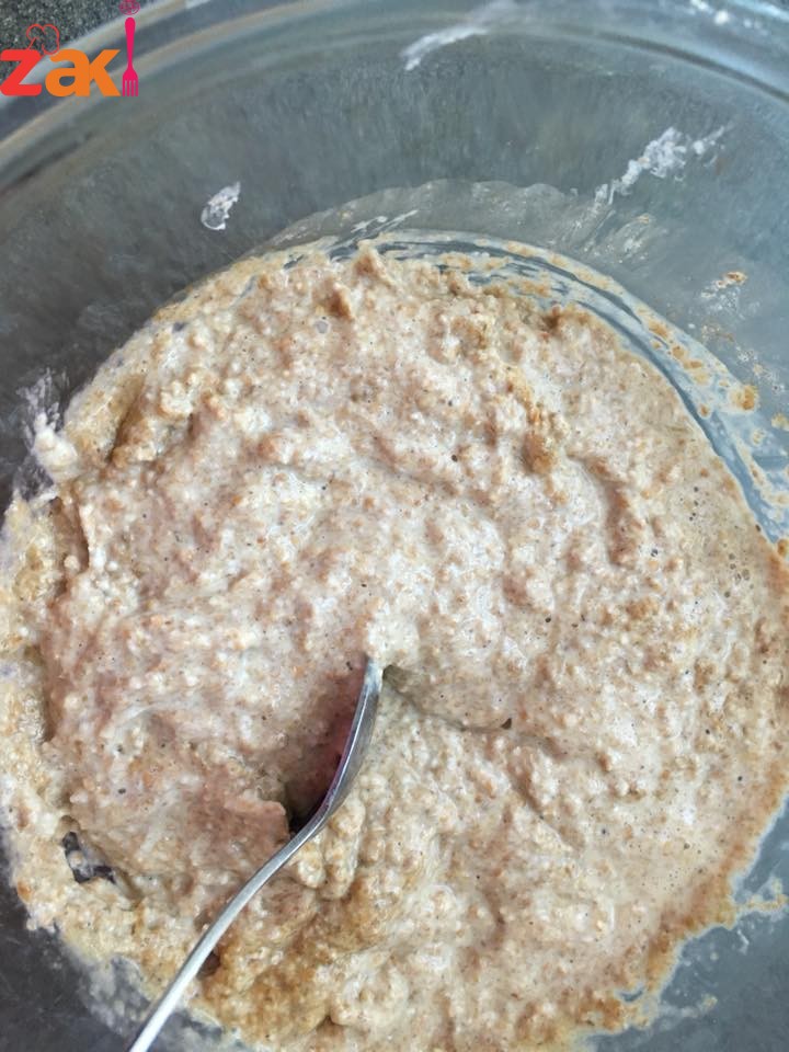 الخميرة هي عبارة عن طحين حوالي نص كوب اي نوع بس انا استعملت طحين القمحة الكاملة