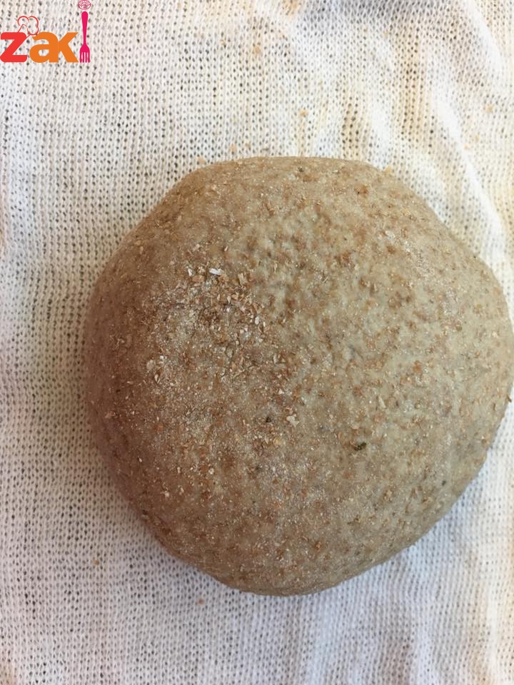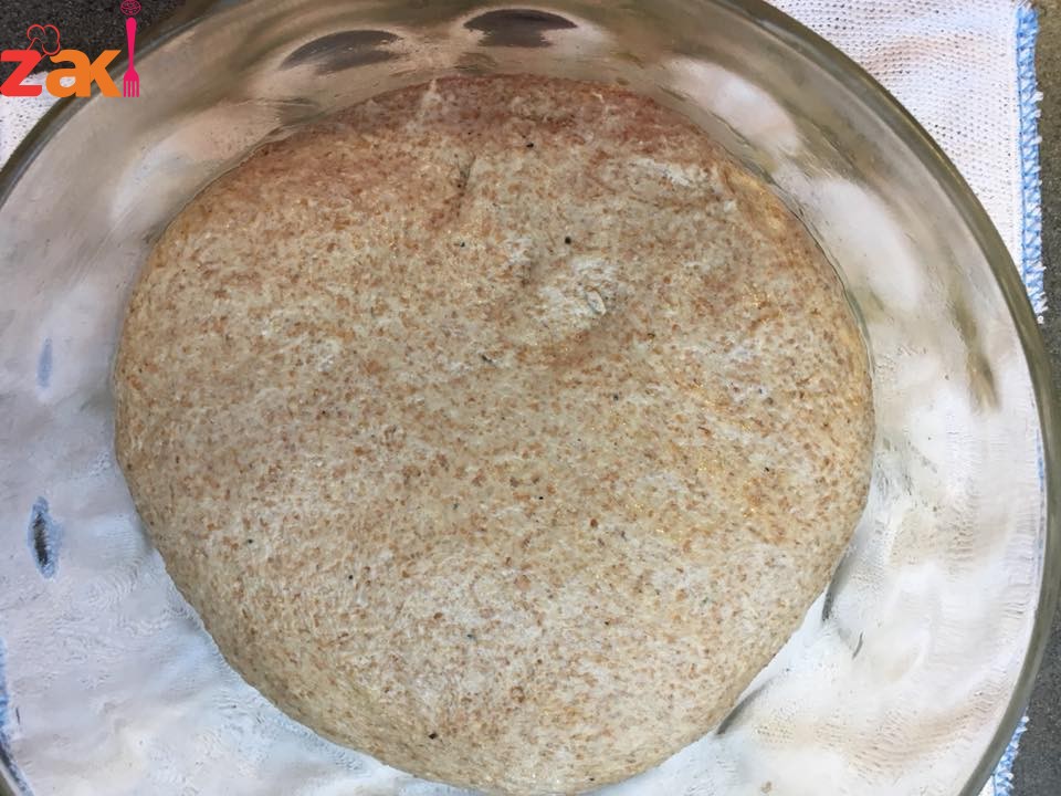 وطحين قمح كامل أربع أكواب خلطتهن مع معلقة ملح. وخلطت الخميرة مع