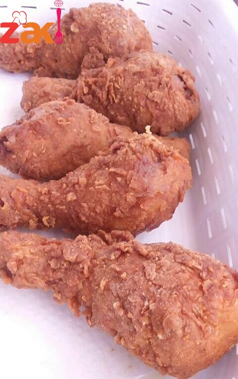 نضع قطع الدجاج أولاً في خليط البيض والحليب ثم يوضع في خليط البروستيد ونغلفه جيداً بالخليط وممكن ان تعيد الخطوة مرة اخرى لكن لا تبالغ حتى لا تسقط الطبقة وتصبح كالعجين