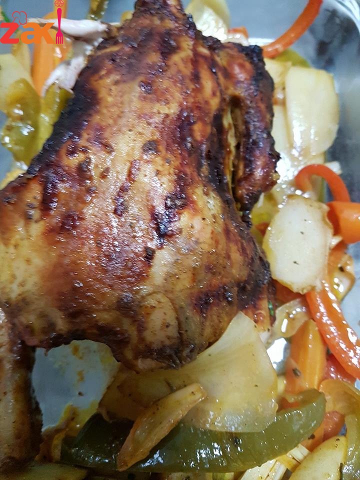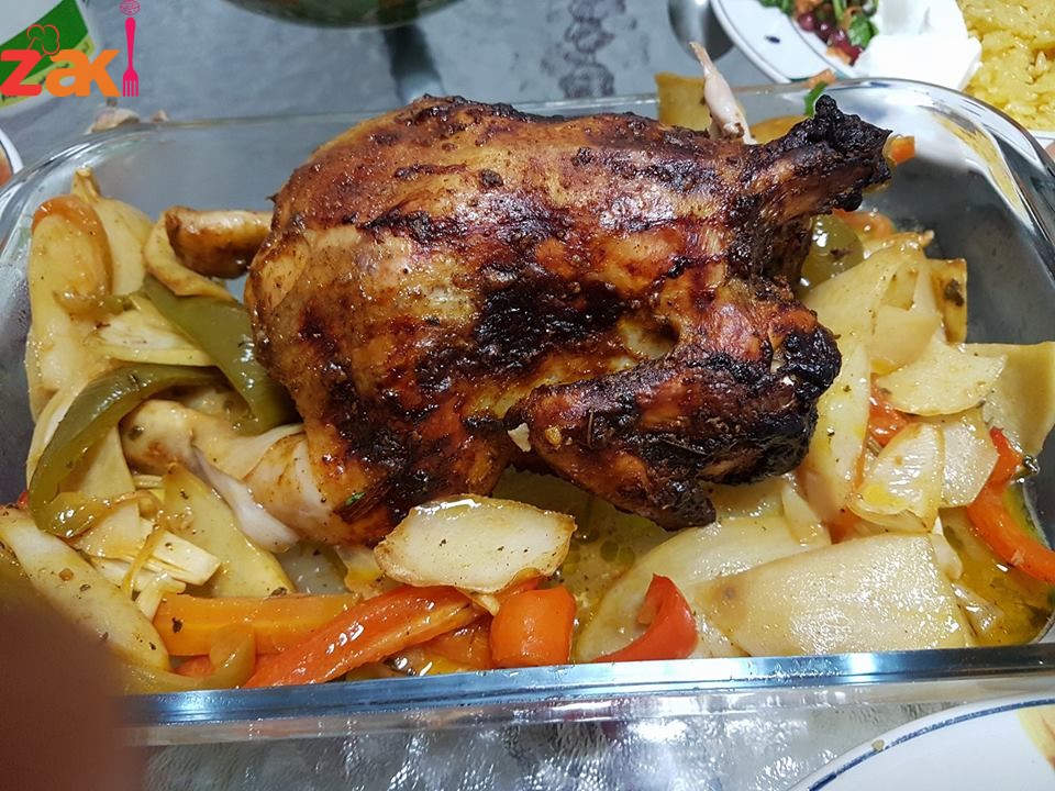 ونضع الجاجة في الصينية او في قالب الكيك المفتوح من الوسط وبتقدري تحطي خضار مقطعه حسب الرغبه ونضع في الصينية ماء ربعها