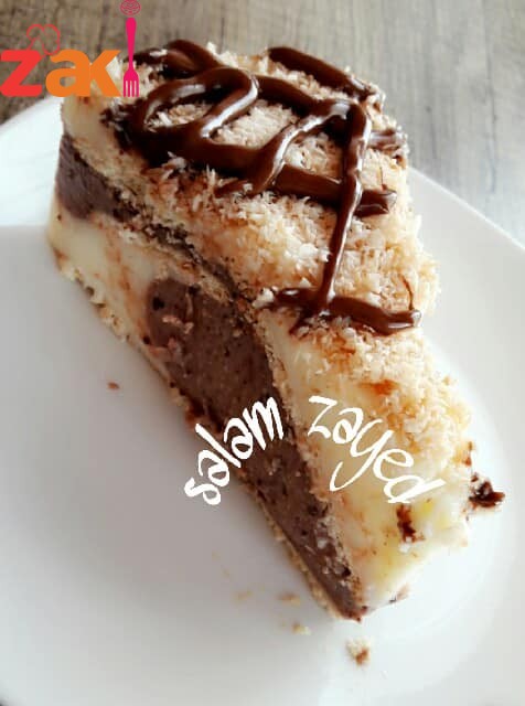 بدمج كل المقادير سوا الكاكاو وبتأكد انه النشا داب تماما بحطها عنار متوسطة مع التحريك المستمر ليثقل القوام عندي بقسم الخليط لجزئين باخد جزء وبضيفله الكاكاو وبحركه كتير منيح .. برتب بالصينية او قالب التشيز كيك طبقة بسكوت ثم طبقة مهلبية بيضا ثم طبقة بسكوت ثم مهلبية كاكاو وهيك لاخلص كل المقدار الي عندي وحسب رغبتكم كم طبقة بدكم واخر شي بزينها بجوز الهند المحمص او غير محمص وممكن بسكوت مكسر صغير وبخططها بالشكولاته حسب رغبتكم وبتركها لتصير بحرارة الغرفة وبدخلها عالتلاجة لتبرد وتتماسك منيح مو اقل من 4 ساعات وصحتين وهنا