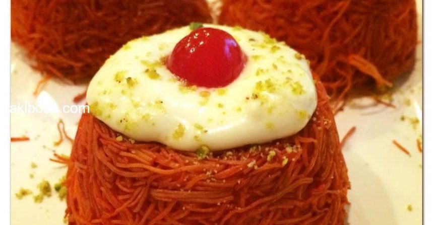 8- وتسقى بالقطر البارد عند إخراجها من الفرن ، وتقلب في صحن التقديم ، وتزين حسب الرغبة ، وهنا زينت بگيمر عرب وفستق حلبي وكرز .