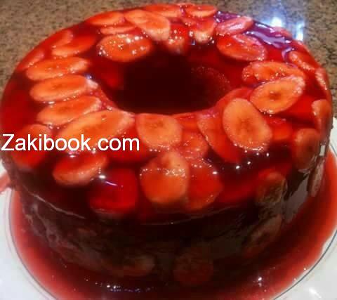 – بس تبرد الكيكه بشيلها من القالب وبوزع قطع فراوله او موز او اناناس الي متوفر عندك في قاع القالب وبكون عامله (ثلاث باكيتات جلي نكهة الفراوله ) خففت انا كمية الماء وضعت 5 كاسات على 3 باكيتات الجلي, بضيف نص كمية الجلو فوق الفاكهه وبرجع الكيكه على القالب وبضيف باقي الجلو على الكيكه من فوق.
