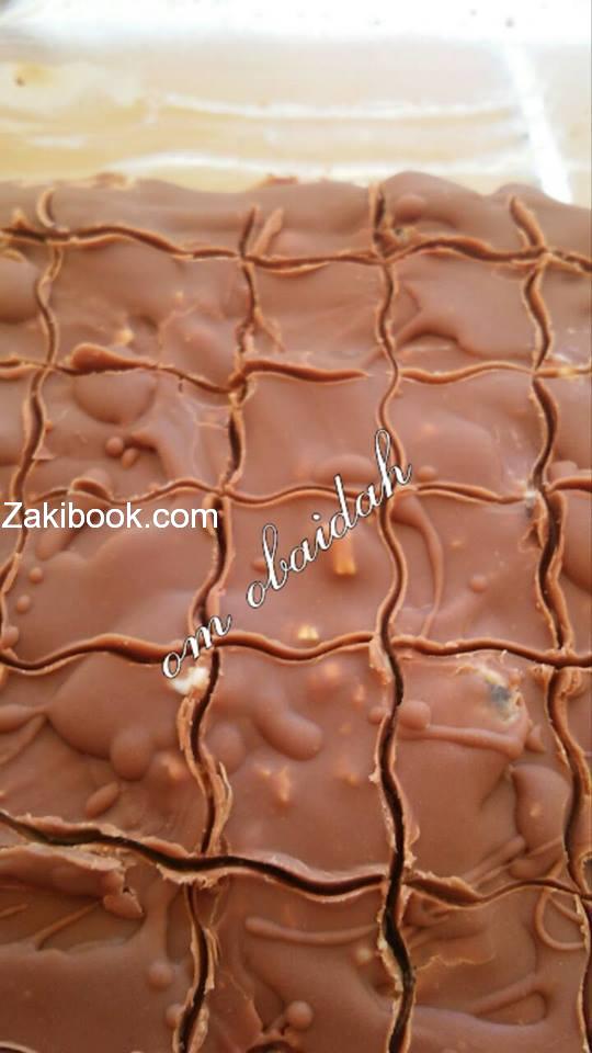 – بعد ما نطلعها بنعمل الشوكولاته على حمام ماء وبنضيف عليها 2 ملعقة كبيرة زيت وبنضيفها فوقها للشكل بقطاعه البيتزا المتعرجه.