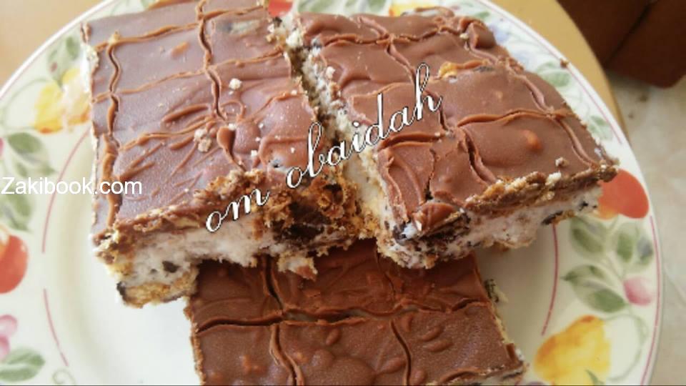 – في صحن بايركس مربع نغمس حبات البسكوت في الكاكاو وبنرصه وبعدين خليط البوظه وبعدها كمان طبقه بسكوت وعلى الفريزر 12 ساعه.