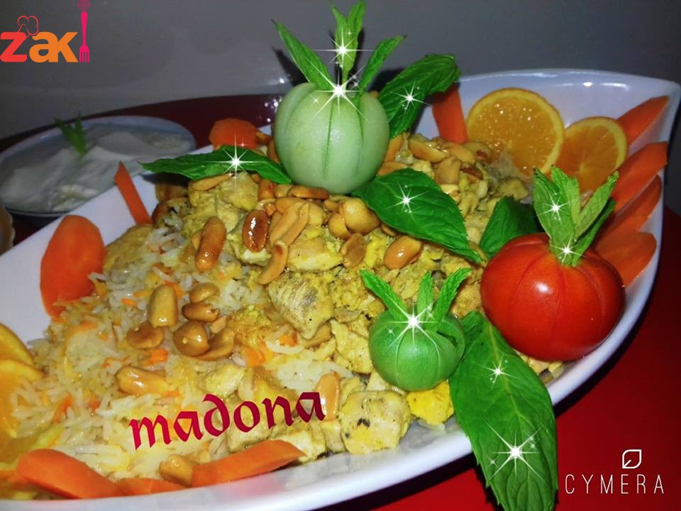 ونسكب الارز وفوقه شرحات الدجاج..ونزينه بفستق الطبخ…