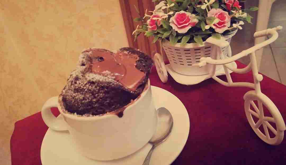 بتخلطي المقادير منيييح بعدين بتسقطي فوقهم مكعبات من اي لوح شوكولا بتحبيه انا حطيت جالكسي وبتحطي ملعقتين مي بس بدون تحريك وبالمايكرويف من دقيقه ل دقيقه و ٣٠ ثانية وزينيها بالسكر البودرة وصحه وهنا كتييير لزيزة