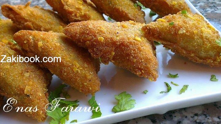 – وتاخذي عجينه السمبوسه وتلفي بيها الخطله مثلثات, بعدين تغطسيهن في بيض متبل بشوية ملح وفلفل اسود وفلفل احمر وقرفه, وتجهزي شوية خبزه مدقوقه بقسماط امخلطه مع شبس الدوريتوس مهروش.