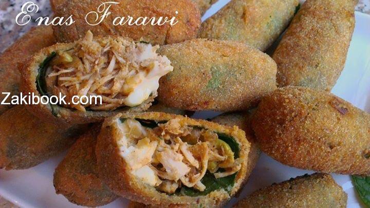 – ناخذ كل طرف سلق ونحط فيه عصاج الدجاج وطرف صغير من جبنة ابو الولد ونلفه ونغطسه في البيض المتبل بشوية ملح وفلفل اسود والفلفل الاحمر وقرفه وبعدين نغطسه بالبقسماط., وتكرر هذه العمليه مرتين او ثلاثه ونقليه.