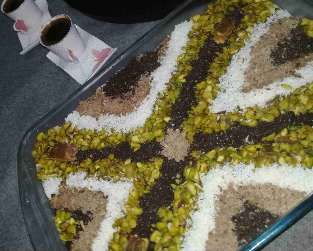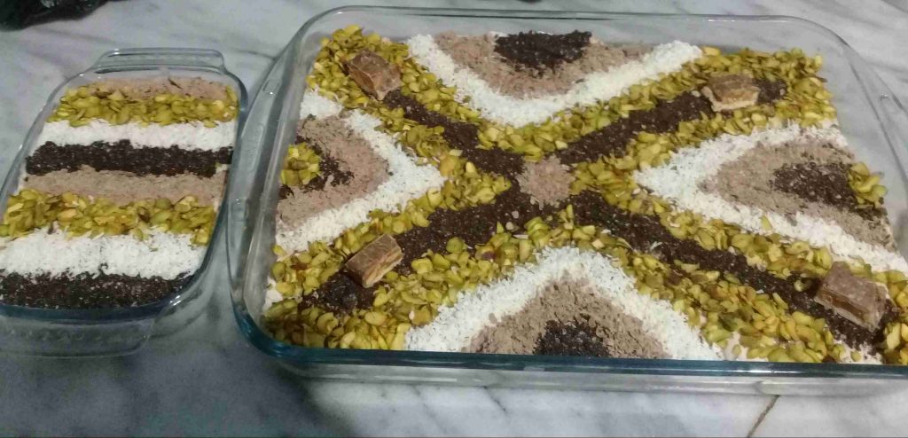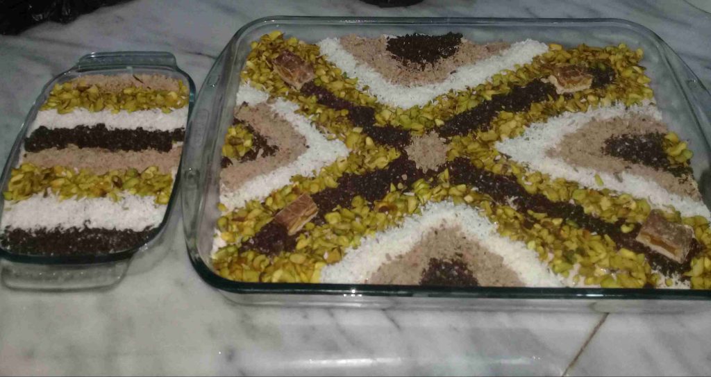 • التزين : بسكويت قلقسي مبشور.. فستق حلبي.. جوز الهند.. بسكويت اوريو مطحون ..
