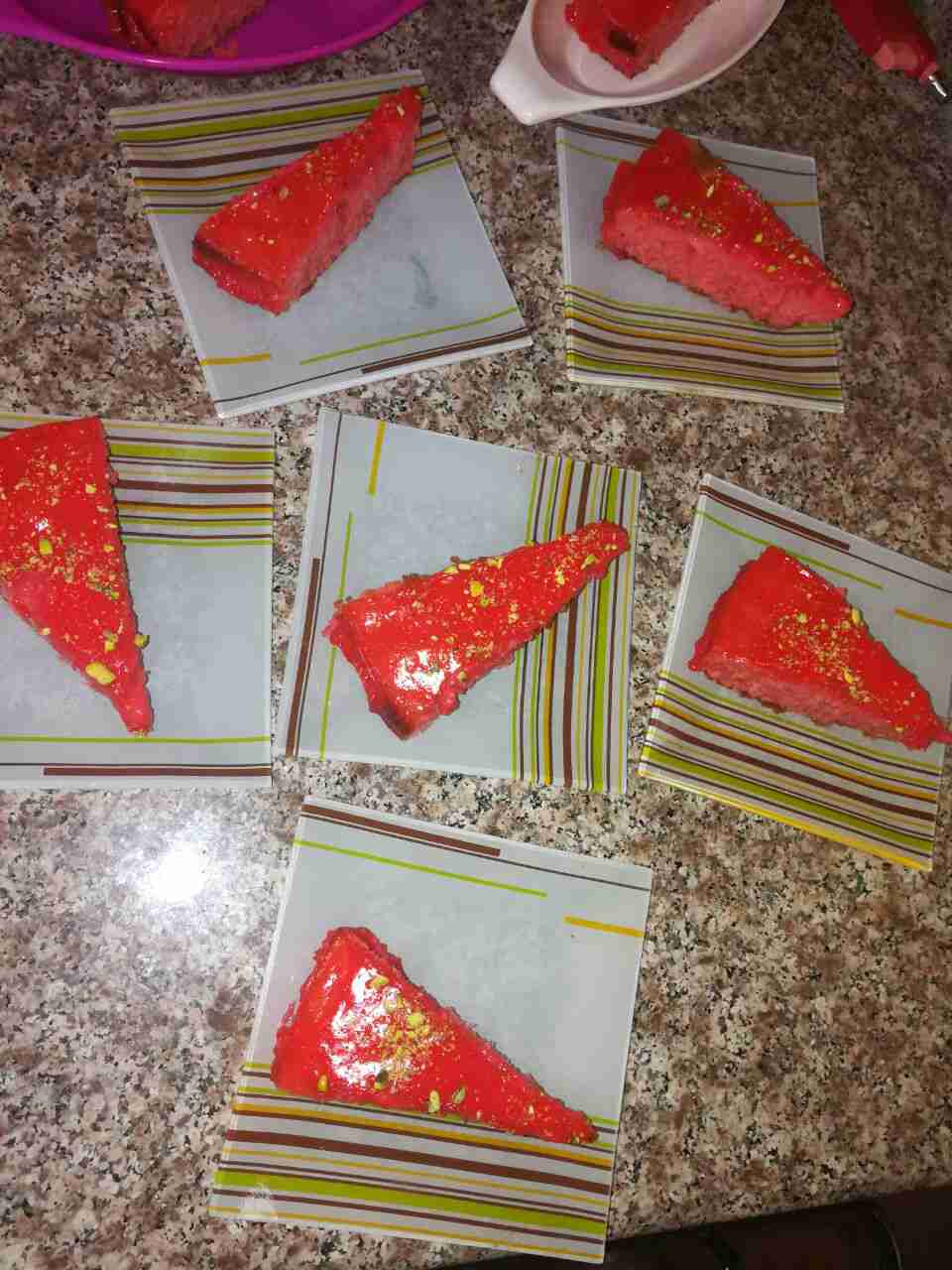 نحرك ونصب الخليط بصينية مدهونة بالزيت والطحين بالفرن لمدة 25دقيقة وبعد ما تجهز نضيف عليها كوب يلي شلناه ونرجعها للثلاجة حتى تبرد تزين بالفرولة او الفستق الحلبي وصحتين وعافية جربوها كثير سهلة
