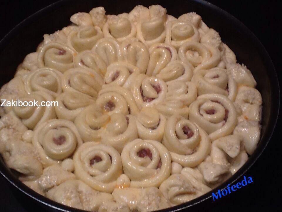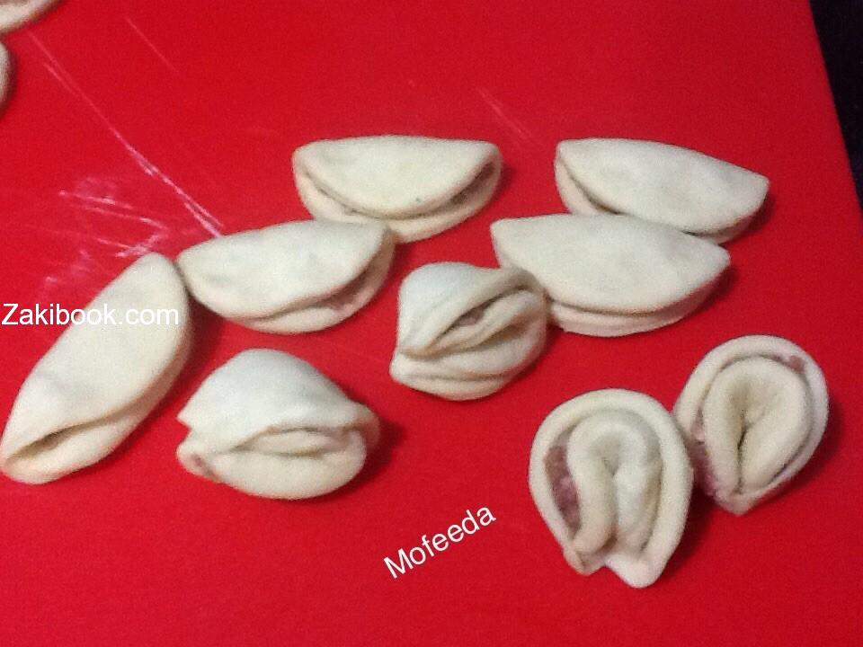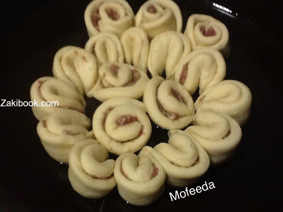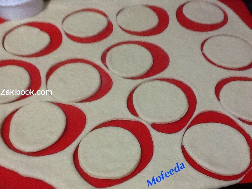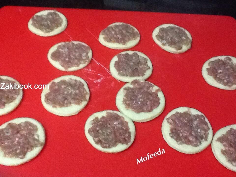 * بعد ان تخمر العجينة ترق بالمرقاق وتقطع دوائر وتحشي الدوائر بالمفروم.