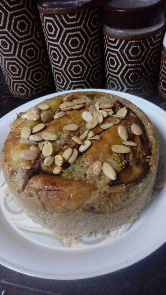نضع طبقة من الباذنجان في قاع طنجرة الطبيخ ، ثم الدجاج المقلي بزيت الباذنجان ثم طبقة اخرى من الباذنجان والبطاطا و البصل المقلي والثوم