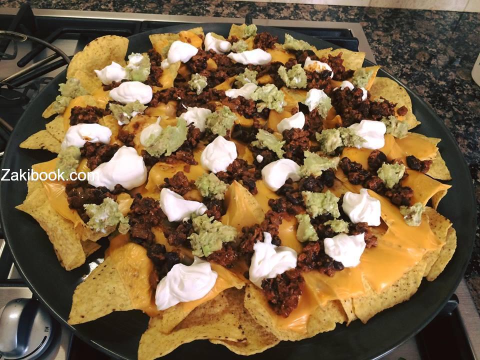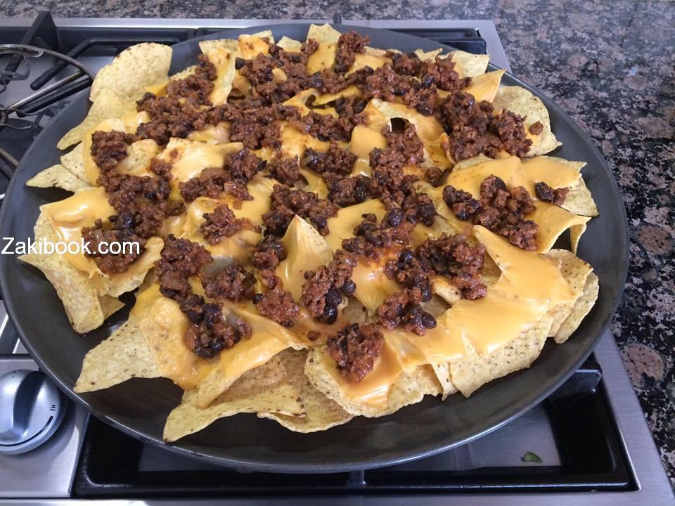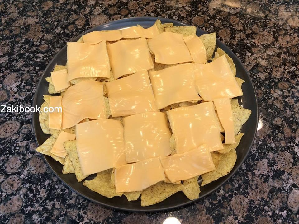 – نفرش شيبس الذرة في صينية فرن ونصف فوقه جبنة الكرافت الشرائح ونضعها في الفرن على درجة حرارة ٤٠٠ لحين ذوبان الجبنة تقريباً ١٠ دقائق.