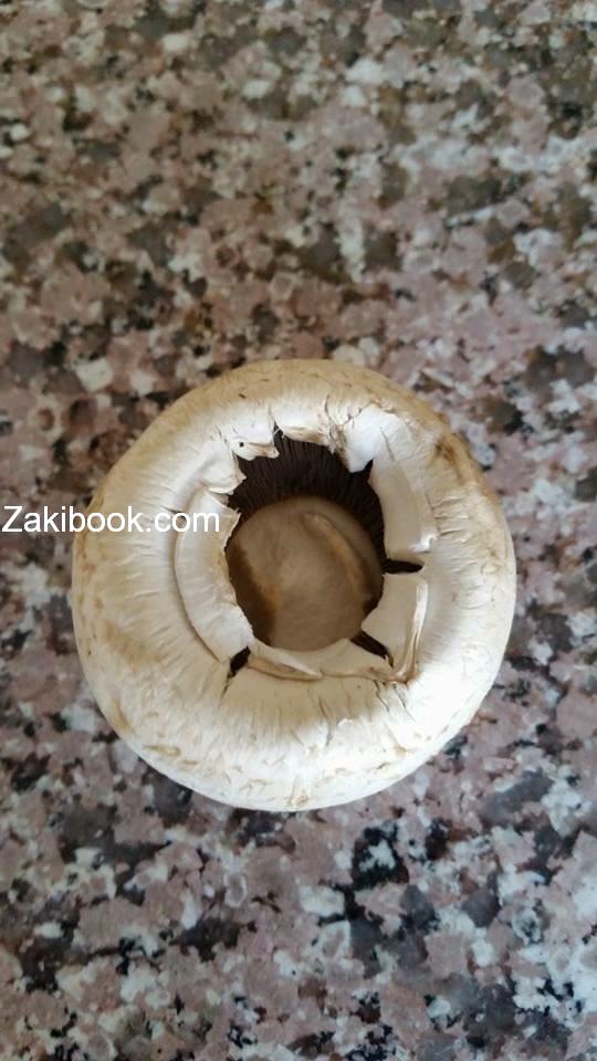 – هلا الفطر بس تقلبيه شوفي بكون فيه فتحه كبيره فراغ هاد بيتعبى جبنه مخلوطه ببصل ناعم وبينحط فلفل اسود شوي ورشه توم ناعم, وممكن تحشيه باللحم المفروم, أو أي نوع حشوة إنتي وعائلتكم بتفضلوه.
