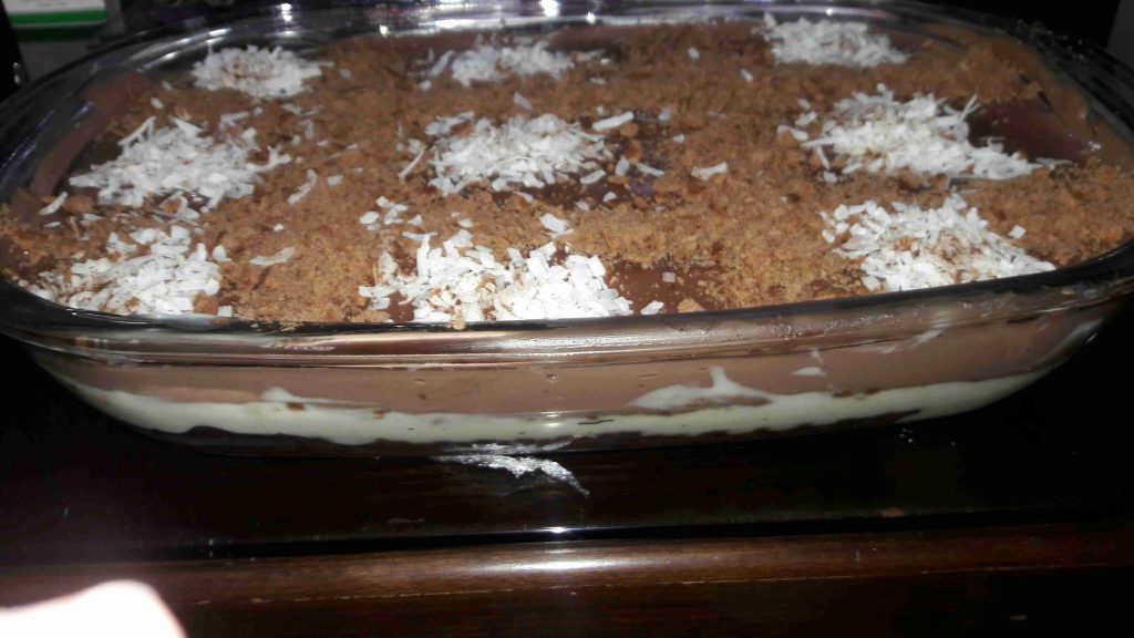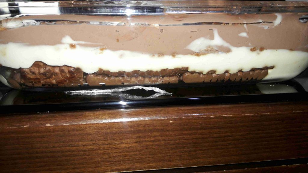 نضع طبقتين من البسكوت بالبايركس ومنشربه بالنسكافي ونضع عليه نص كميةالخليط بعد أن نعيد خلطه بالخلاط كمان مره حتى تخف كثافته ومنحضر الطبقه التالته من البسكوت بعد ما نسقيه بالنسكافي وبعدين منضيف على النصف التاني من الخليط الكاكاو ومنحرك منيح ومنحطه على طبقة البسكوت التاليه