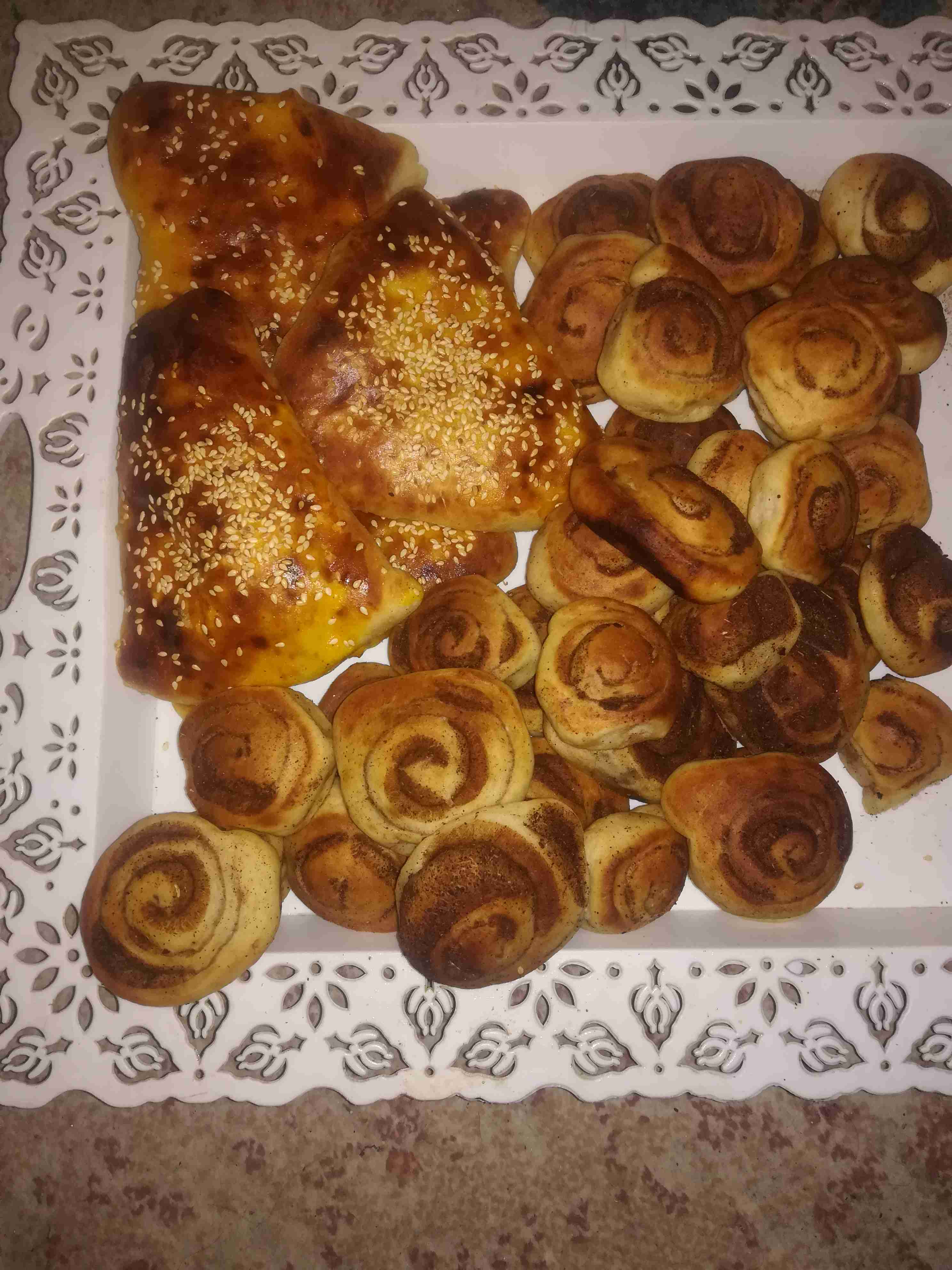 اما لفائف القرفه انا وضعت بس قرفه والقليل من زيت الزيتون ونزيهن المعجنات باسمسم اما للتزيين استعملت صفار البيض وحليب سائل فقط