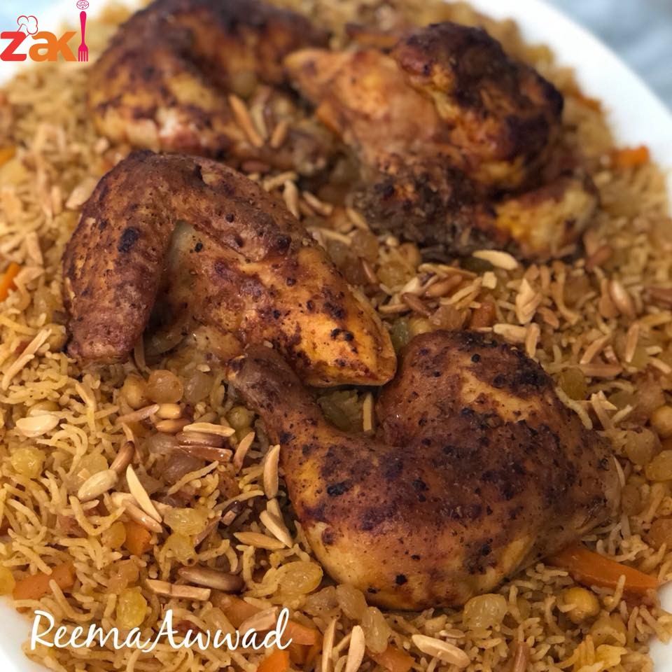 ونصفي الأرز ونضيفه ونقلب جميع المكونات بخفة، نغمر الأرز بمرق سلق الدجاج حتى يرتفع عن سطح الأرز ب ١/٢ ١ سم تقريبا، نغطي القدر ونتركه على نار عالية حتى يتشرب الأرز الماء على السطح ثم نخفف النار ونترك الأرز على نار هادئة حتى ينضج تماما، نفرغ الأرز في طبق التقديم ونرتب قطع الدجاج فوقه ونزينه بالمكسرات والزبيب ويقدم وصحتين