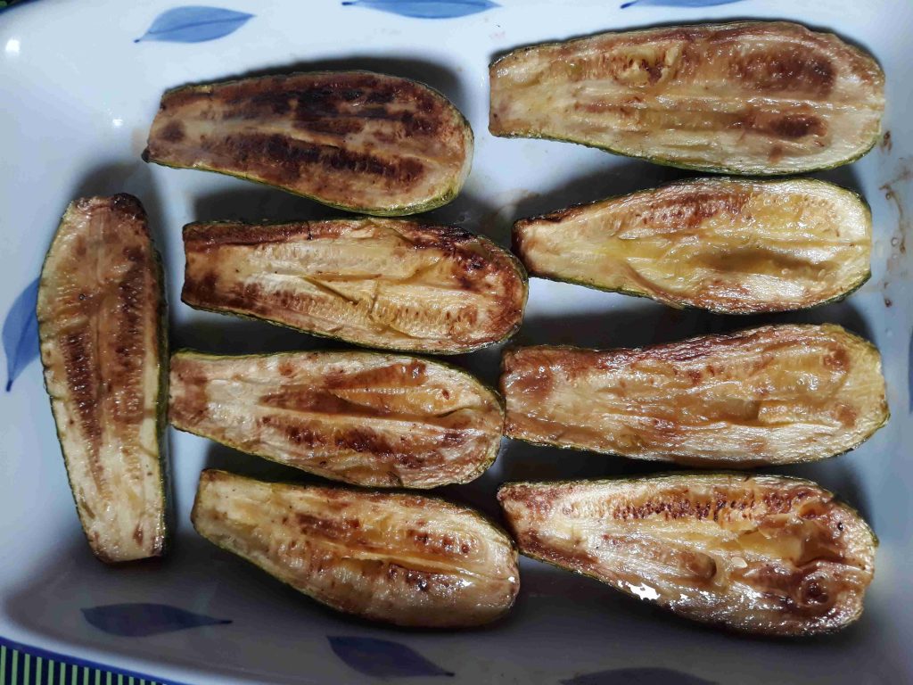 بنقلي حبات الكوسا على نار خفيفه منشان ما ينزلو مي وبنقلبهن لما لونهن يسير ذهبي بنطلعهن من الزيت وبنصفهن بصينيه الفرن
