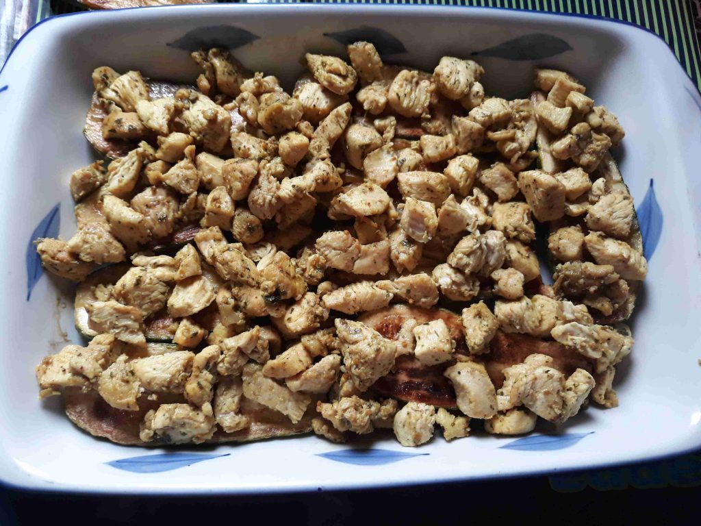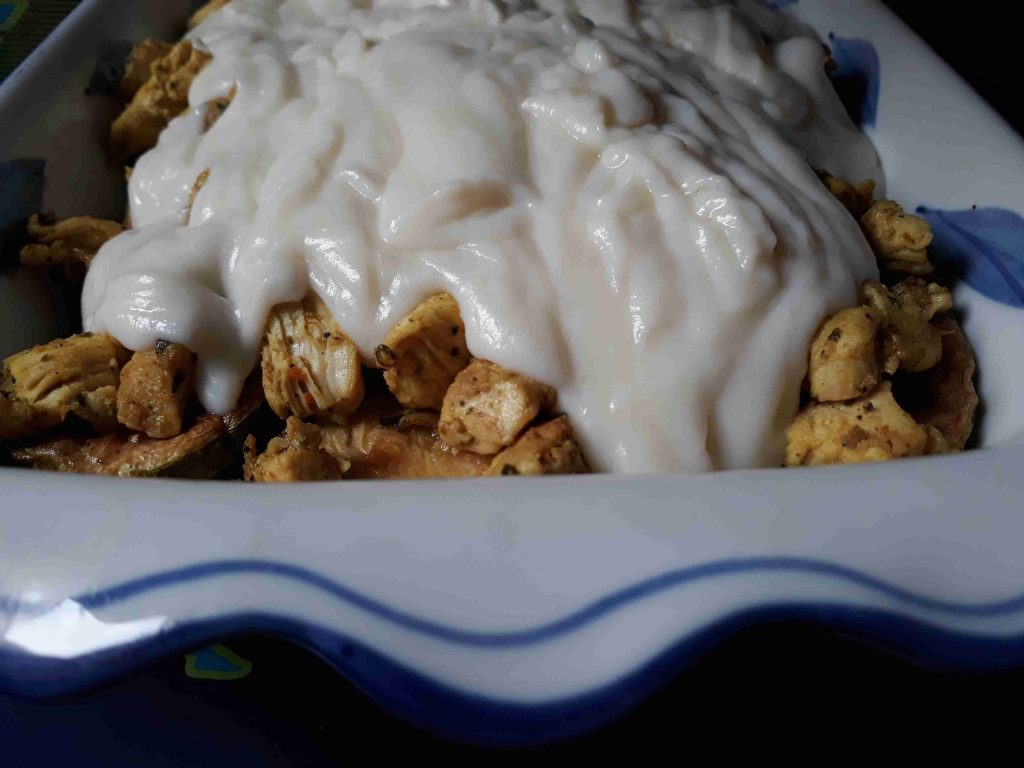 بنقلي صدور الدجاج المفرومين مكعبات مع معلقه زيت ورشه ملح ورشه فلفل اسود ورشه بهارات ربع ساعه تقريبا مع التحريك بين كل فتره وفتره بعد ميستوي الدجاج بنديرو فوق طبقه الكوسا وبنصفو بكل الصينيه وبعد هيك عطول بنحضر الباشميل بنذوب الزبده على الغاز وبنضيف الطحين وبنحركو منيح منشان ما يتكتل معنا وبنحمر الطحين شوي مع الزبده لما يتغير لونو شوي بنضيف الحليب وبنستمر بالتحريك لما يثقل قوام الباشميل عطول بنديرو فوق طبقه الكوسا والدجاج وبندخلو على فرن حامي لمده ربع ساعه تقريباا وبنحمر وجه صينيه الباشميل وتقدم مع السلطات والف صحه وهناا