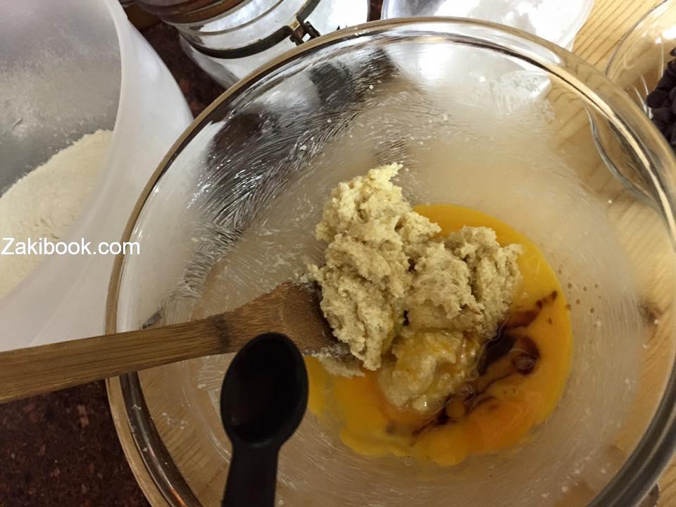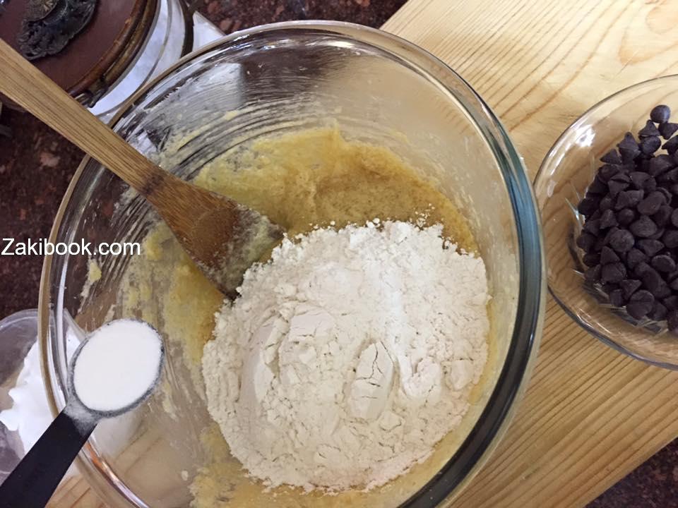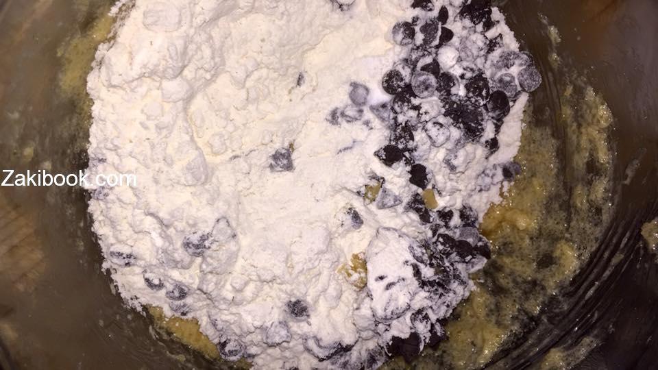 – الان ضيفي كاسة ونص طحين وربع ملعقة صغيره ملح وملعقه صغيره كربونات الصودا وكاسة من حبوب الشوكولاته اخلطي المزيج.