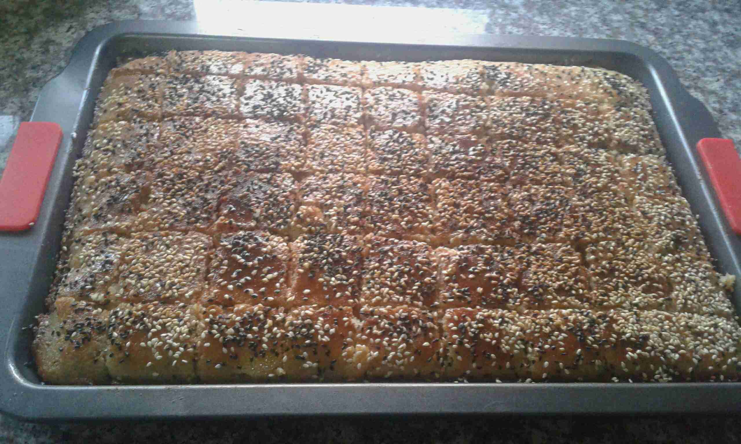 وبدخلها الفرن المحمى مسبقا على درجة حراره 180 براقبها كويس لم تتحمر اطراف الصينيه بحمرها وبطلعها من الفرن وبصب عليها القطر او الشيره وهو بارد وهي بتكون ساخنه
